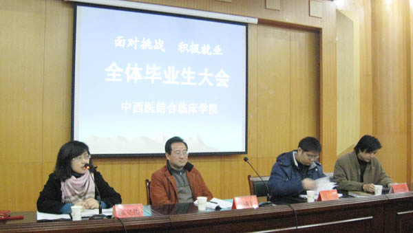 为进一步促进2010届毕业生就业工作,3月5日,中西医结合临床学院召开了主题为“面对挑战、积极就业”全体毕业生大会。 该院党总支书记吴成长分析了2010年就业形势,他要求广大学生,要明确目标、苦练内功、合...