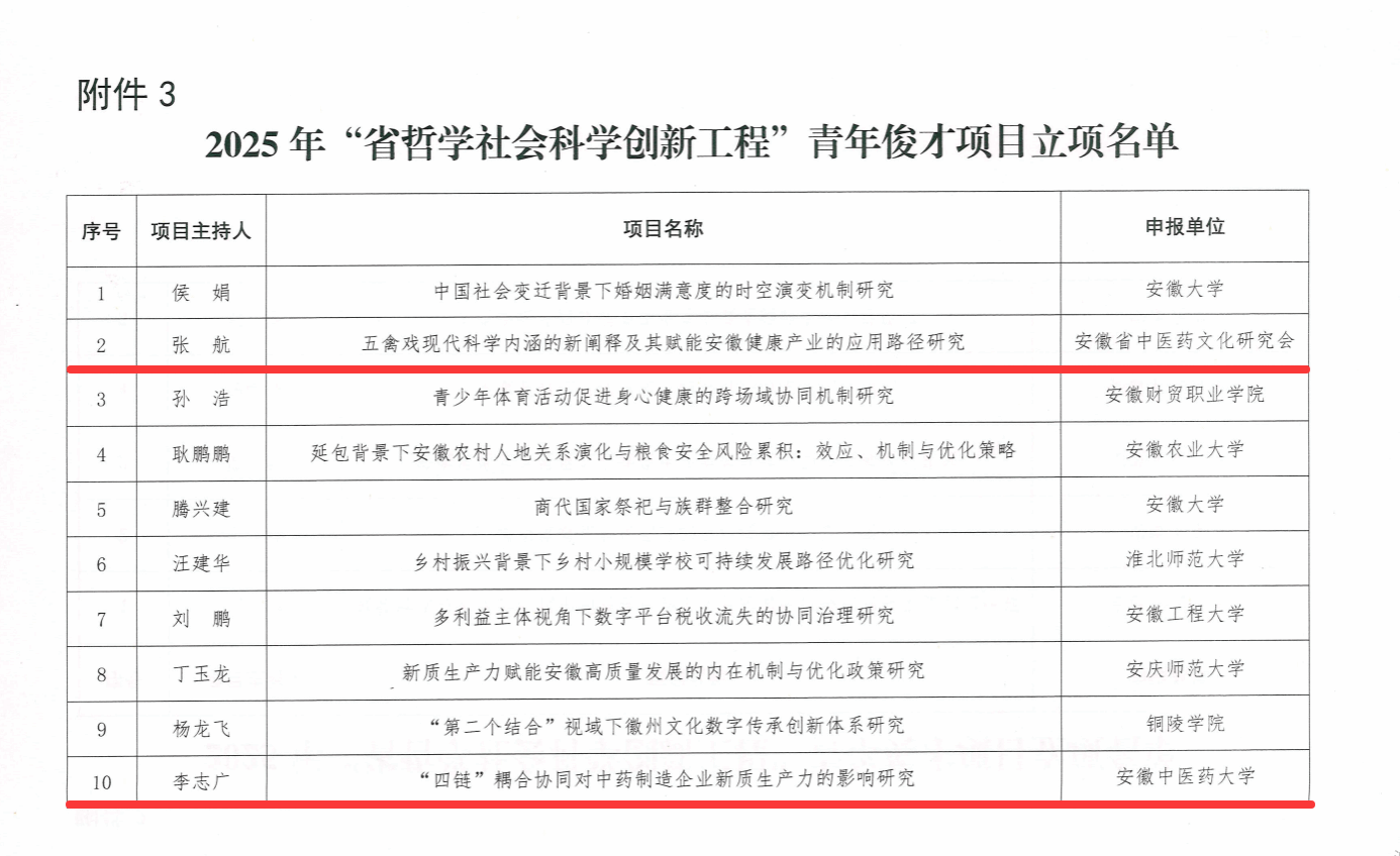近日,安徽省社会科学界联合会公布2025年“省哲学社会科学创新工程”优秀青年项目及创新团队立项名单,学校医药经济管理学院李志广、人文与国际教育交流学院张航入选2025年“省哲学社会科学创新工程”青年俊才项目。