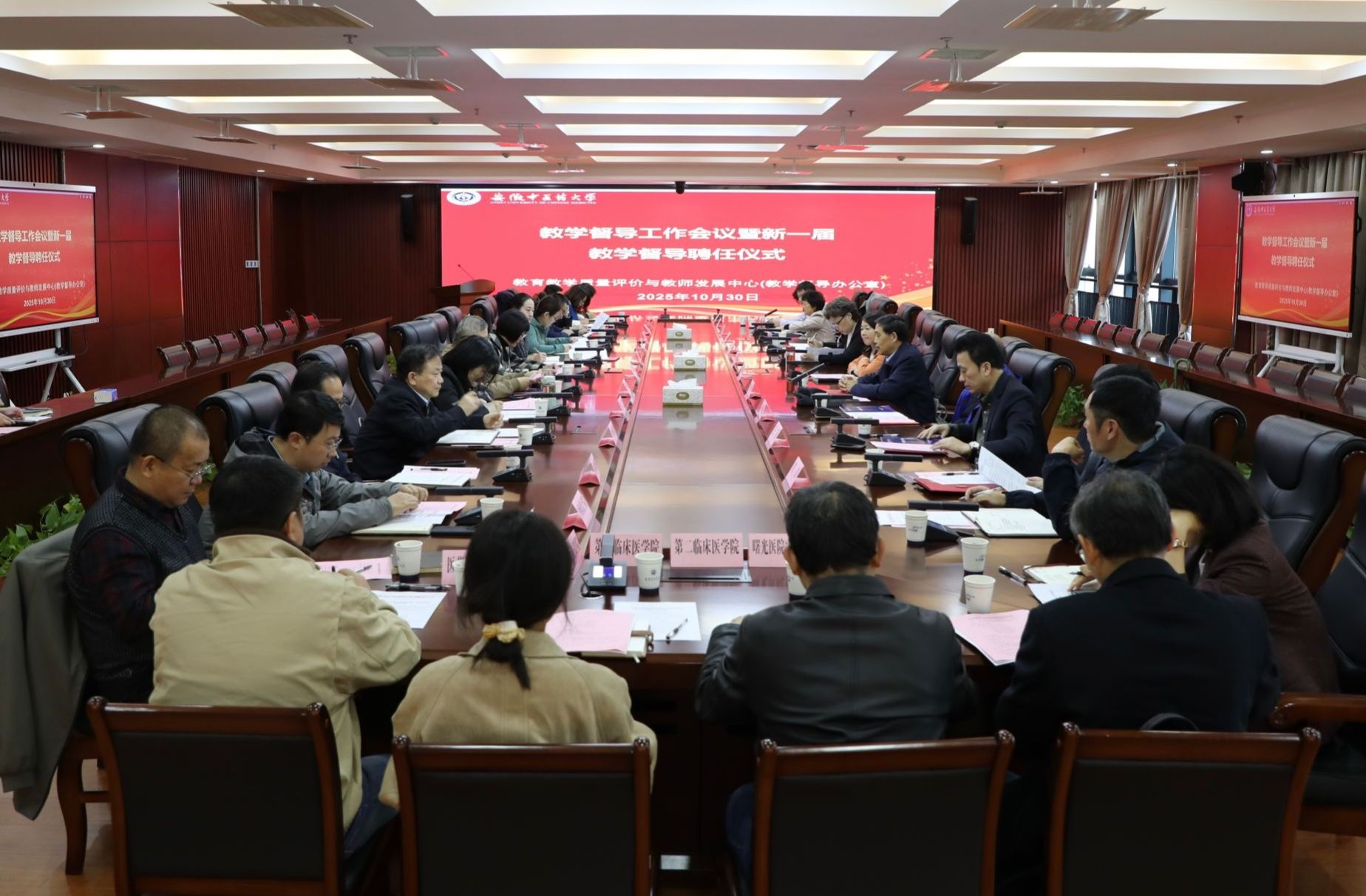 教育教学质量评价与教师发展中心主任张晓军主持仪式并宣读《关于聘任储全根等18 位同志为新一届学校教学督导的通知》,桂双英向教学督导颁发聘书。