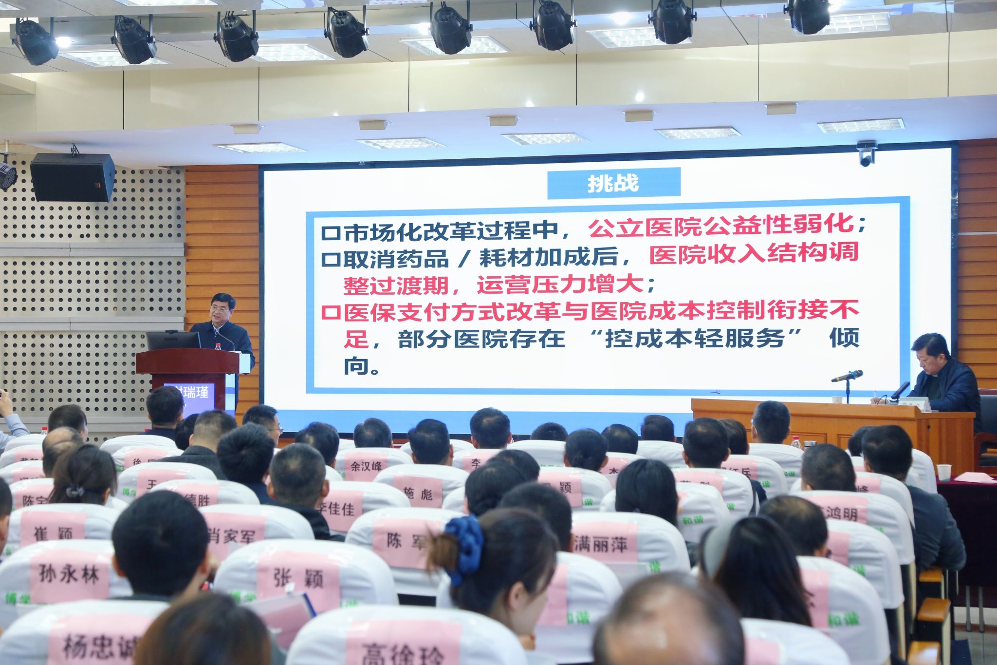 揭牌仪式后,谢瑞瑾应邀出席蚌埠市公立医院高质量发展系列培训班并做主题报告。会上,谢瑞瑾以《关于深化以公益性为导向的公立医院改革思考》为主题,从公立医院改革的重要性、公立医院发展历程、我省公立医院改革实践、公立医院改革展望等几个方面以详实的数据和生动的案例分析公立医院改革的路径与方向,为进一步提升我省卫生健康系统医疗服务质量,破解公立医院在“三医”协同治理、公益属性保障、运行效率提升等方面指明了方向。他强调公立医院应坚守公益性底色,深化改革创新,奋力书写从“以治病为中心”迈向“以人民健康为中心”的时代新篇章。