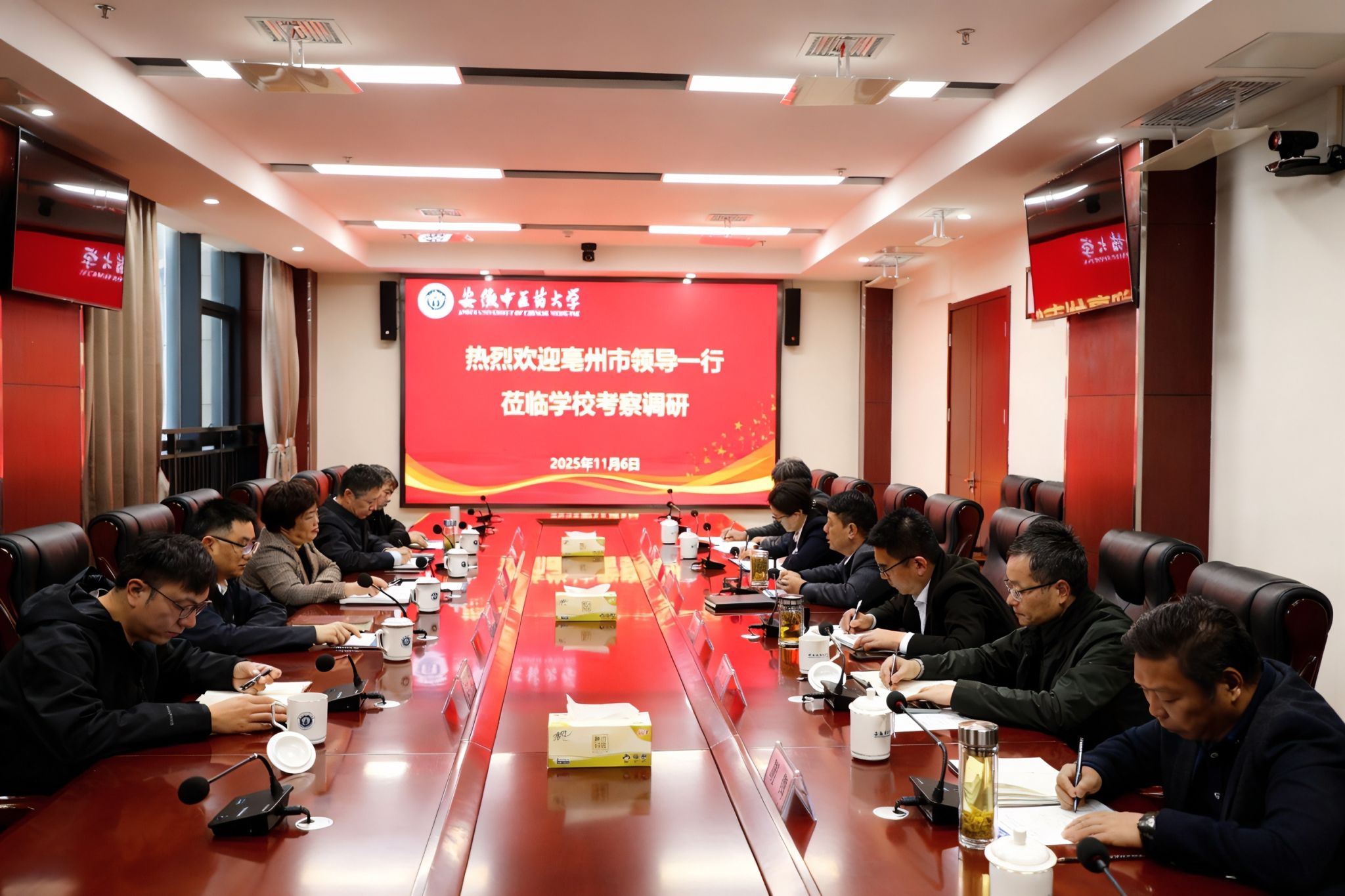 许钒向曹振萍、李庆林一行表示热烈欢迎,他指出,亳州市具有独特的文化底蕴,中草药资源丰富,市场潜力巨大。学校与亳州市的合作源远流长,双方在人才培养、科学研究、导师聘任等领域建立了良好的合作基础。他表示,在“十五五”期间,双方要进一步深化校地合作,加强互动交流,促进中医药传承创新,更好服务地方产业发展。