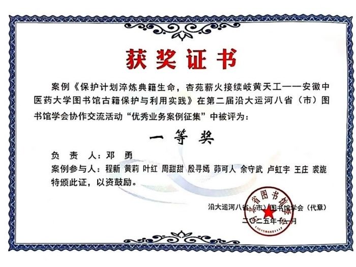 此次在跨省域的高水平交流平台上获奖,不仅是对图书馆(档案馆)古籍工作专业化、系统化实践的充分肯定,更是对图书馆(档案馆)坚守专业精神,守护中医药文化遗产、推动中华优秀传统文化创造性转化与创新性发展之路的积极印证。图书馆(档案馆)将以此为契机,持续深化古籍的整理、挖掘与研究,不断提升保护水平,拓展活化利用途径,让流淌在典籍中的岐黄薪火,在新时代绽放更加璀璨的光芒,为传承发展中医药文化、弘扬中华优秀传统文化作出新的、更大的贡献。(邓勇/文图 程新/审核)