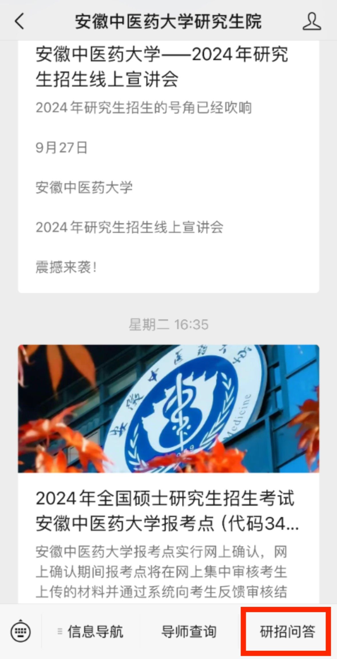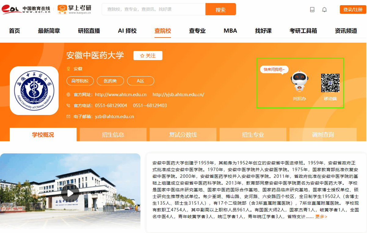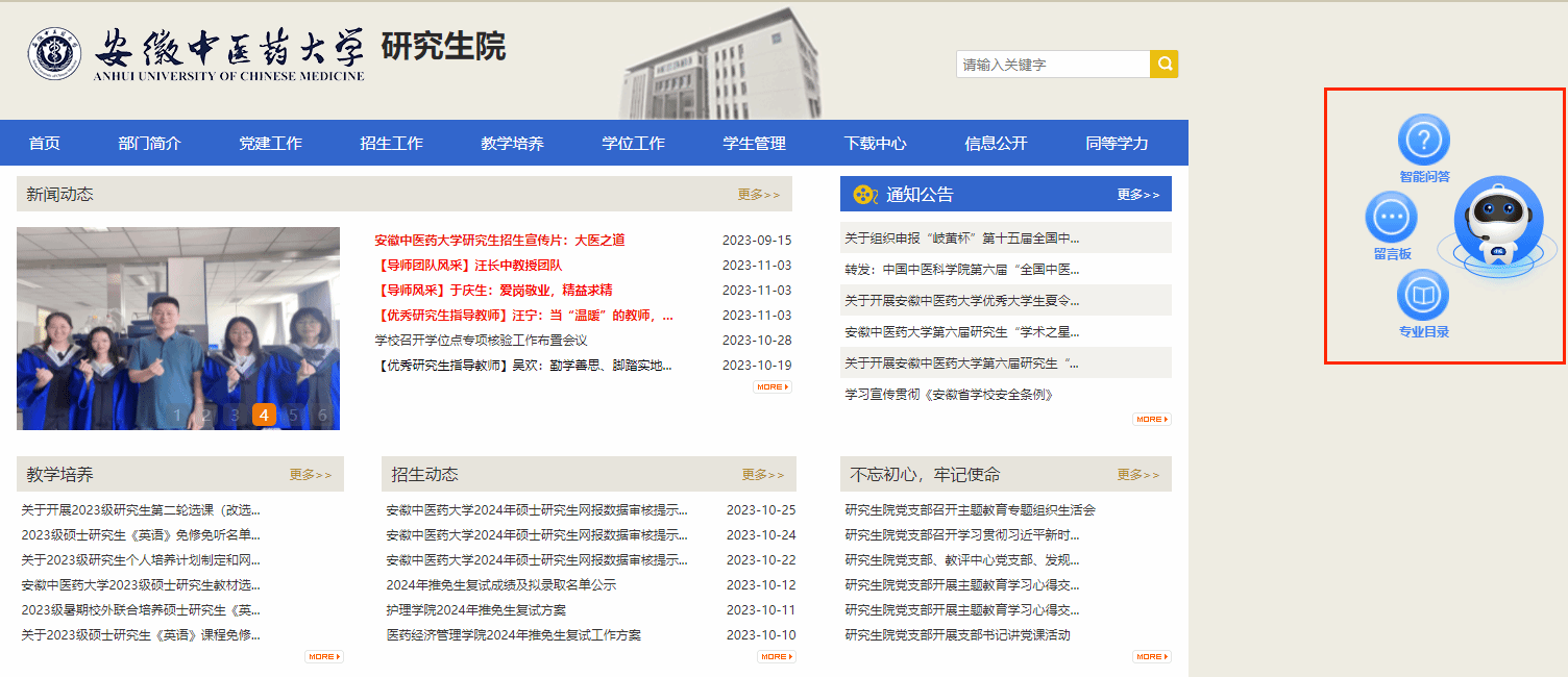 点击访问Beat365唯一官方网站研究生院网站(https://yjsb.ahtcm.edu.cn/),如下图所示访问学校官方网站,点击招生问答功能: