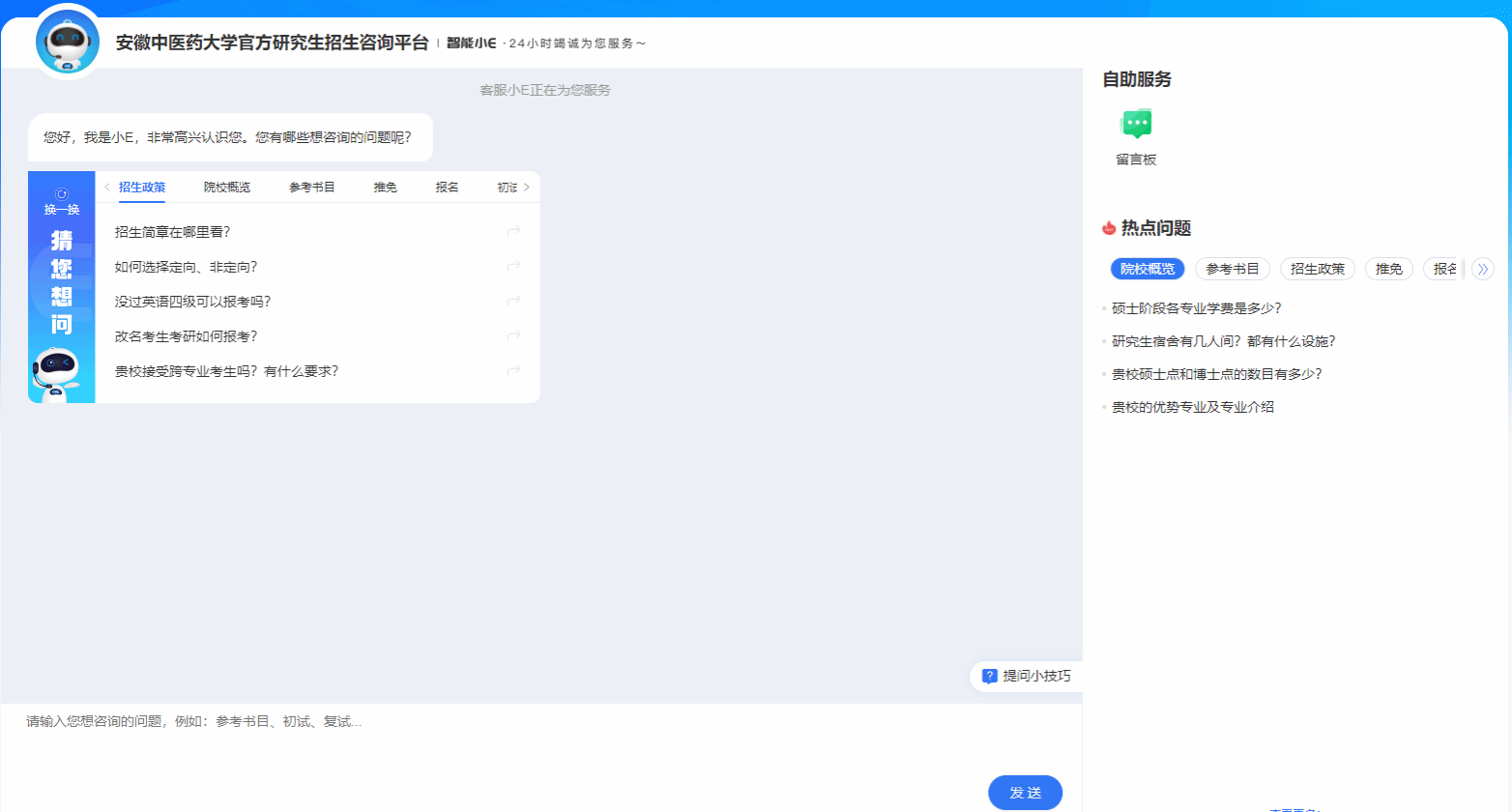 为方便广大考生了解Beat365唯一官方网站研究生招生相关信息,确保学校研究生招生各项工作安全、平稳、有序进行,Beat365唯一官方网站研究生院增加了线上咨询-智能问答系统(下文简称小E)。