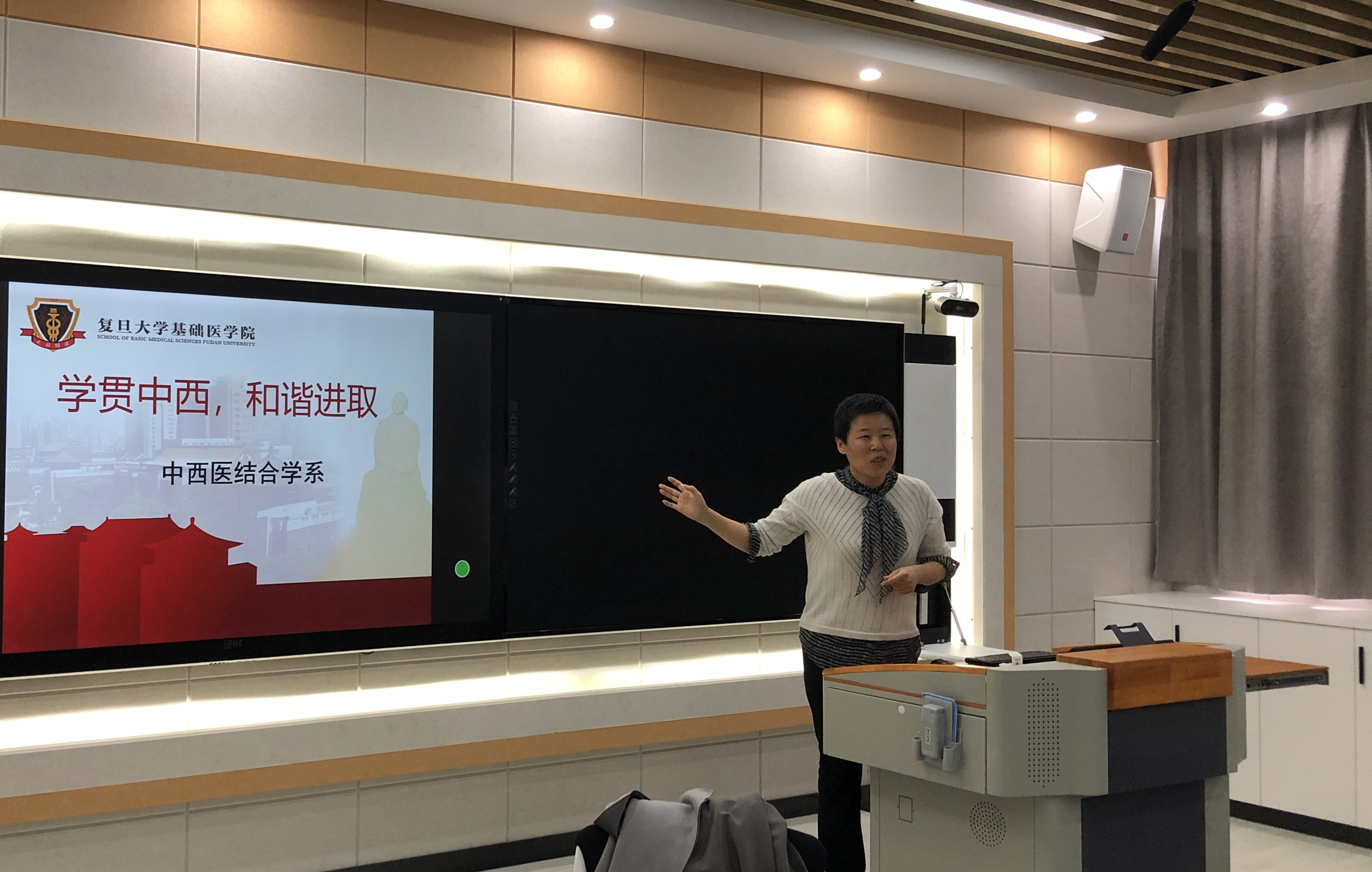 王彦青教授从复旦大学基础医学院发展历史和现状的介绍,展示了上海复旦大学针刺镇痛研究的辉煌历史;以“镇痛史、针刺镇痛、胶质细胞——中西医结合镇痛基础研究漫谈”为题,详细展示了针刺镇痛研究历程、成果和经验,对胶质细胞和镇痛的深入研究方向进行了展望,期待能在未来的科学探索中,取得更加丰硕的成果。课程结束后,王教授与现场师生就相关内容进行了热烈的讨论与交流。