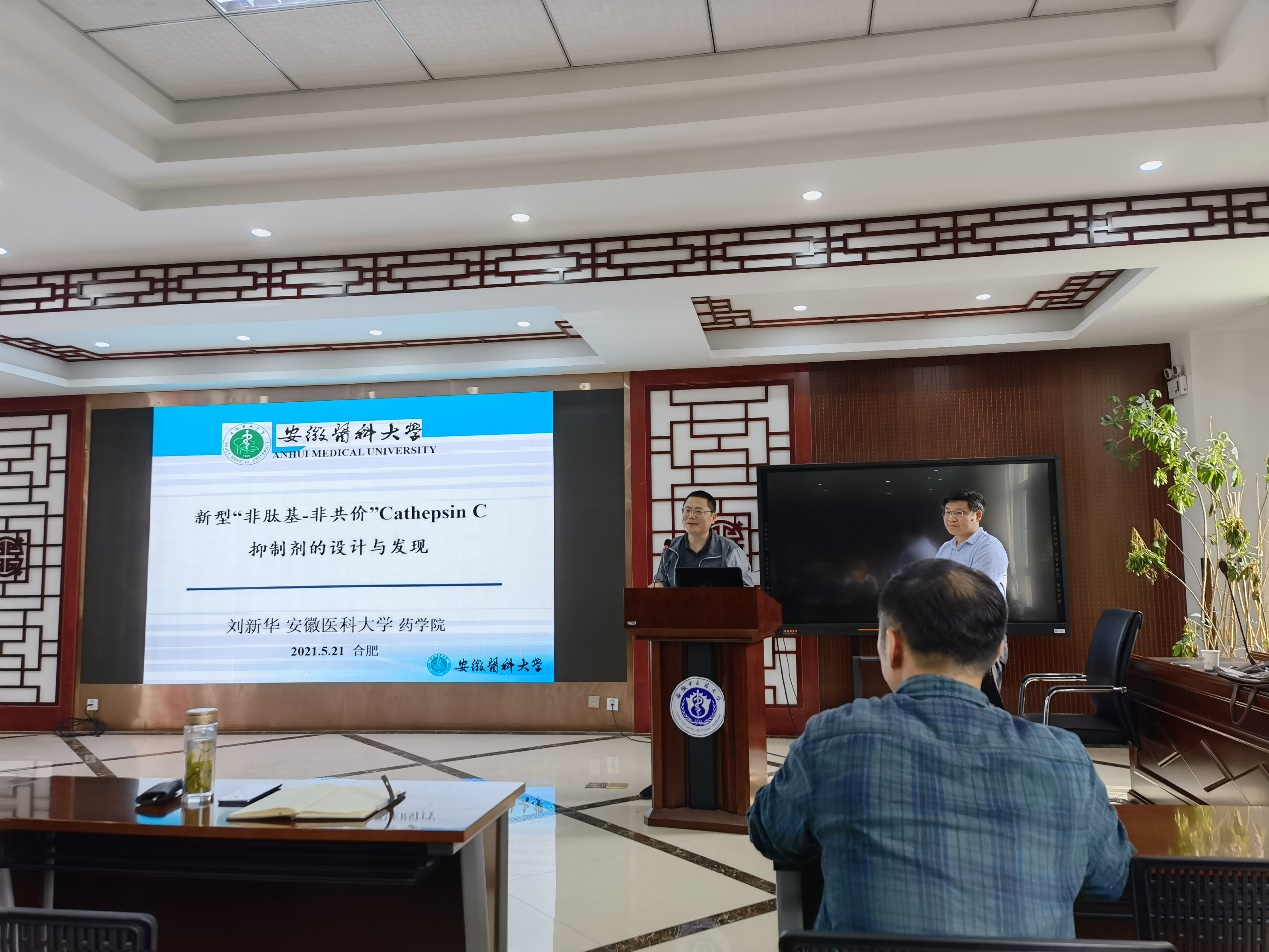 5月21日,安徽医科大学刘新华教授应邀来Beat365作题为《新型非肽基非共价组织蛋白酶C抑制剂的设计合成与抗炎活性》的学术报告。此次学术报告由Beat365唯一官方网站科技处、药学院、安徽省中医药研究院药物化学研究所联合举办。学术报告由药学院副院长尹登科教授主持。
