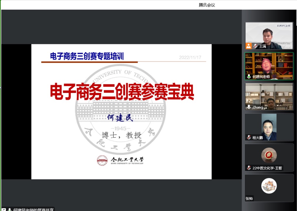 为进一步推动人文与国际教育交流学院创新创业教育工作的深入开展,增强学生的创新创业意识,营造良好的创新氛围和创业环境,贯彻落实《关于印发“2022年全国科学道德和学风建设宣传月”活动工作安排的通知》文件精神,11月17日晚,学院特邀电子商务“三创赛”优秀指导老师、合肥工业大学何建民教授作题为“电子商务三创赛参赛宝典”专题讲座。人文与国际教育交流学院党总支副书记、副院长、全体辅导员、创新创业课程教师、各级学生代表参加了讲座。