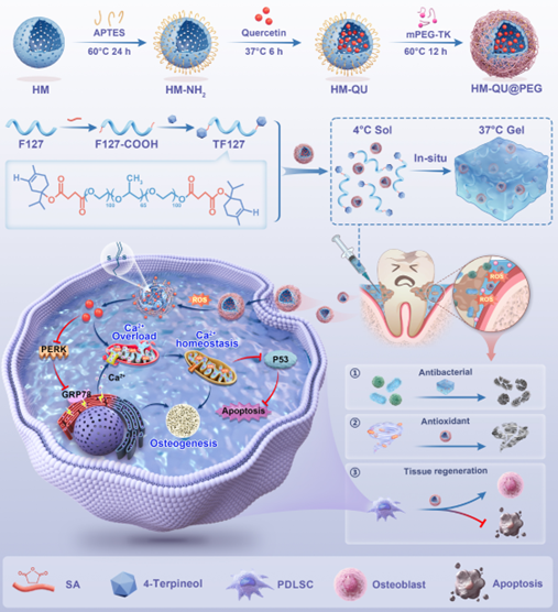 该团队针对牙周炎药物治疗的现实困境,创新提出“抗菌-抗氧化-组织再生”三重功能一体化策略,开发了智能响应型水凝胶系统HQUP@TF127。该体系以中空介孔二氧化硅负载槲皮素,并以硫缩酮键连接的mPEG作为“门控”分子,在炎症微环境高ROS条件下选择性断裂,实现槲皮素的时空可控释放,清除过量活性氧、缓解内质网应激并抑制牙周膜干细胞凋亡;同时,将天然抗菌剂4-松油醇共价接枝至Pluronic F127,赋予基质在体温下的溶胶-凝胶转变能力,显著延长药物在牙周袋内的局部滞留。体外结果显示,TF127兼具温敏性、自修复性与抗菌活性,对牙周炎主要致病菌具核梭杆菌和牙龈卟啉单胞菌均表现出显著抑制效果;在大鼠牙周炎模型中,HQUP@TF127通过减轻免疫炎症与胶原降解、抑制破骨细胞活化,促进组织保护。该研究基于牙周炎病理特征实现触发式给药与长效滞留,不仅为牙周炎提供了兼具抗菌、抗氧化与组织保护的综合治疗策略,也为其他炎症性疾病的智能递药设计提供了有价值的参考,展现出良好的转化前景。