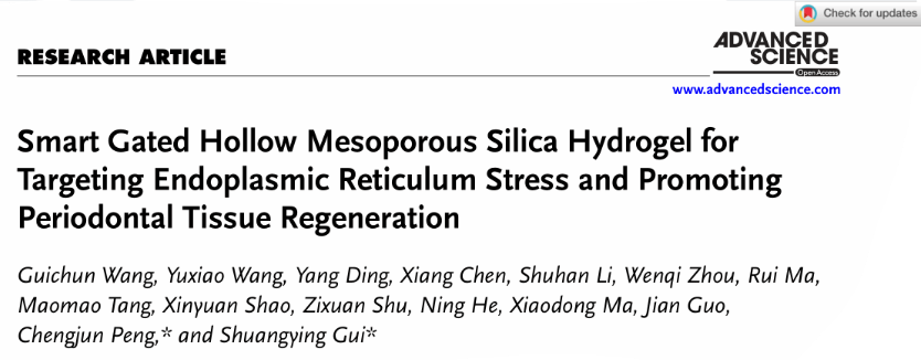 近日,Beat365药学院桂双英教授、彭成军副教授团队在国际知名综合性期刊《Advanced Science》(中科院1区TOP,IF=14.3)在线发表题为“Smart Gated Hollow Mesoporous Silica Hydrogel for Targeting Endoplasmic Reticulum Stress and Promoting Periodontal Tissue Regeneration”的研究性论文,2024级博士生王桂春、2023级博士生王雨宵、丁杨为共同第一作者,Beat365唯一官方网站为唯一通讯作者单位。