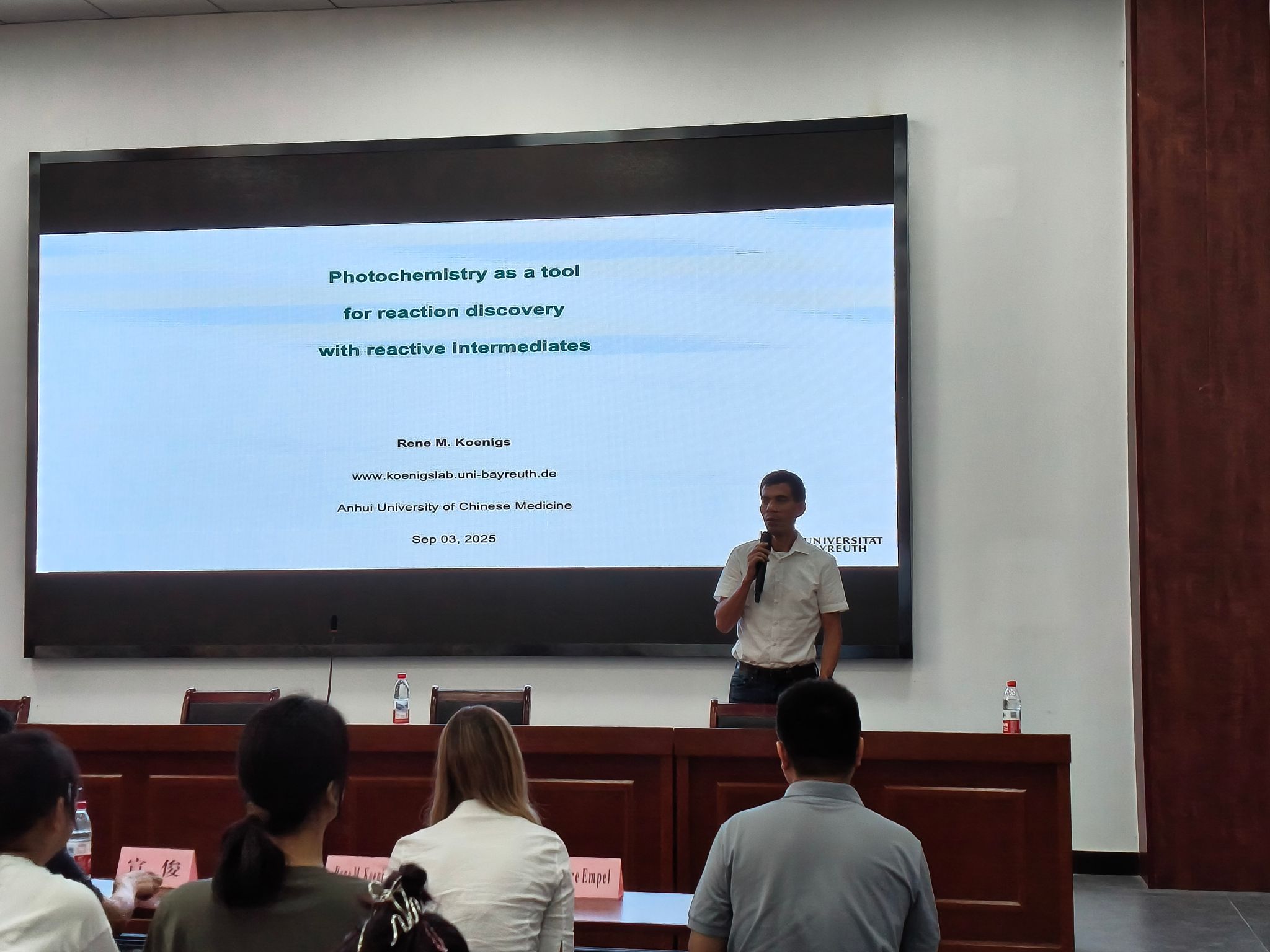 9月3日,由新安医学教育部重点实验室主办、中医学院与药物化学研究所协办的光化学前沿学术报告会在中医学院宅仁堂成功举办。本次会议聚焦光化学在药物合成与材料科学中的前沿应用,吸引了众多师生参与交流。本次会议特邀两位海内外知名学者,德国亚琛工业大学René M. Koenigs教授和安徽大学化学化工学院院长宣俊教授作学术报告,实验室常务副主任童佳兵出席会议。会议由新安医学教育部重点实验室专职副主任吴欢主持。
