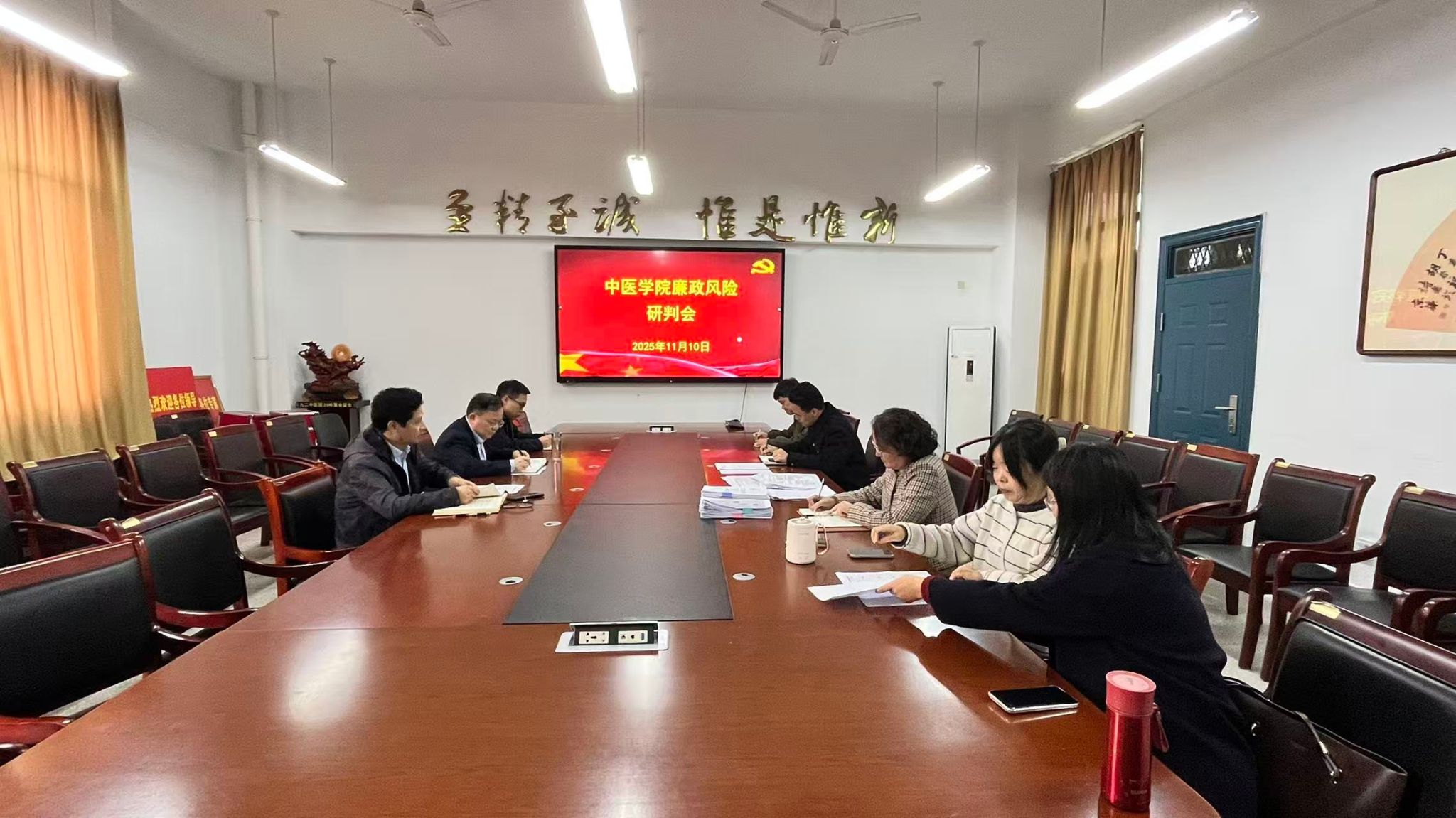 为深入贯彻落实全面从严治党要求,扎实推进廉政风险源头防控工作,11月10日,中医学院组织召开廉政风险专题研判会议。会议由学院党委书记张亚辉主持,学院党政领导班子全体成员、各党支部书记、系部负责人及工会委员代表参加会议。会议聚焦师德师风、人事管理、经费使用等重点领域,全面研究和部署廉政风险排查与防控工作。