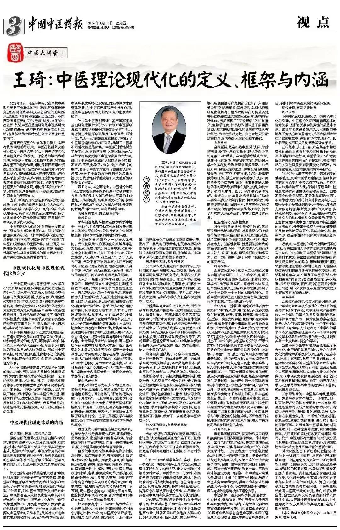 基础研究是整个科学体系的源头,是所有技术问题的总机关。中医药基础研究的核心即为中医理论现代化,中医理论现代化是中医现代化的前提。理论是指导实践的灵魂,理论源于实践,又能指导实践,对实践具有重要的检验作用;理论是解释原理的钥匙,理论是由关于自然界和社会的知识的有系统结论,能够解读基本原理和现象;理论是科学发现的源头,科学的理论能够准确把握客观事物本质和内在规律,促使在实践中挖掘更大的科学发现;理论是引领未来的引擎,有些理论具备超越时代的价值,蕴藏着引领未来的重要动力。