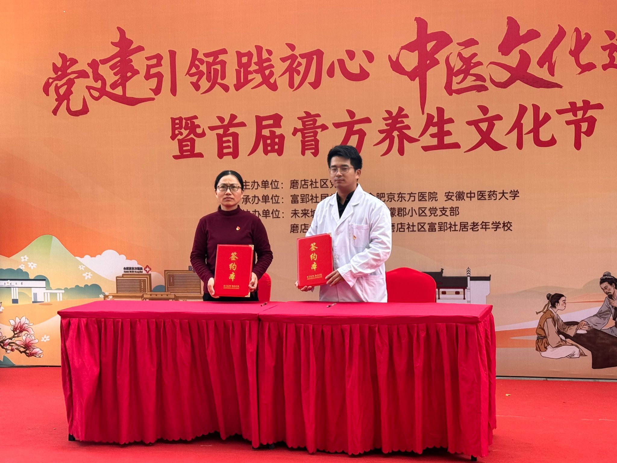 为深化党建引领,弘扬中医文化,践行志愿服务精神,11月8号下午,中医学院教工党支部的教师代表,硕博党支部学生代表赴新站区未来城小区共同参加了“党建引领践初心,中医文化进社区暨首届膏方养生文化节”活动。活动现场,中医学院教工第一党支部与磨店社区柠檬郡小区党支部签署了党建项目结对共建协议书,本次签约,旨在加强双方党组织、党员之间的沟通联系,逐步形成“资源共享、优势互补、共驻共建、共同发展”的基层党建新格局。中医学院党委安排了中医专家健康咨询、中医针灸理疗体验、中药标本制作科普和新安医学趣味问答等4个展台,将中医药服务送到居民家门口,以实际行动诠释中共党员的责任与担当。