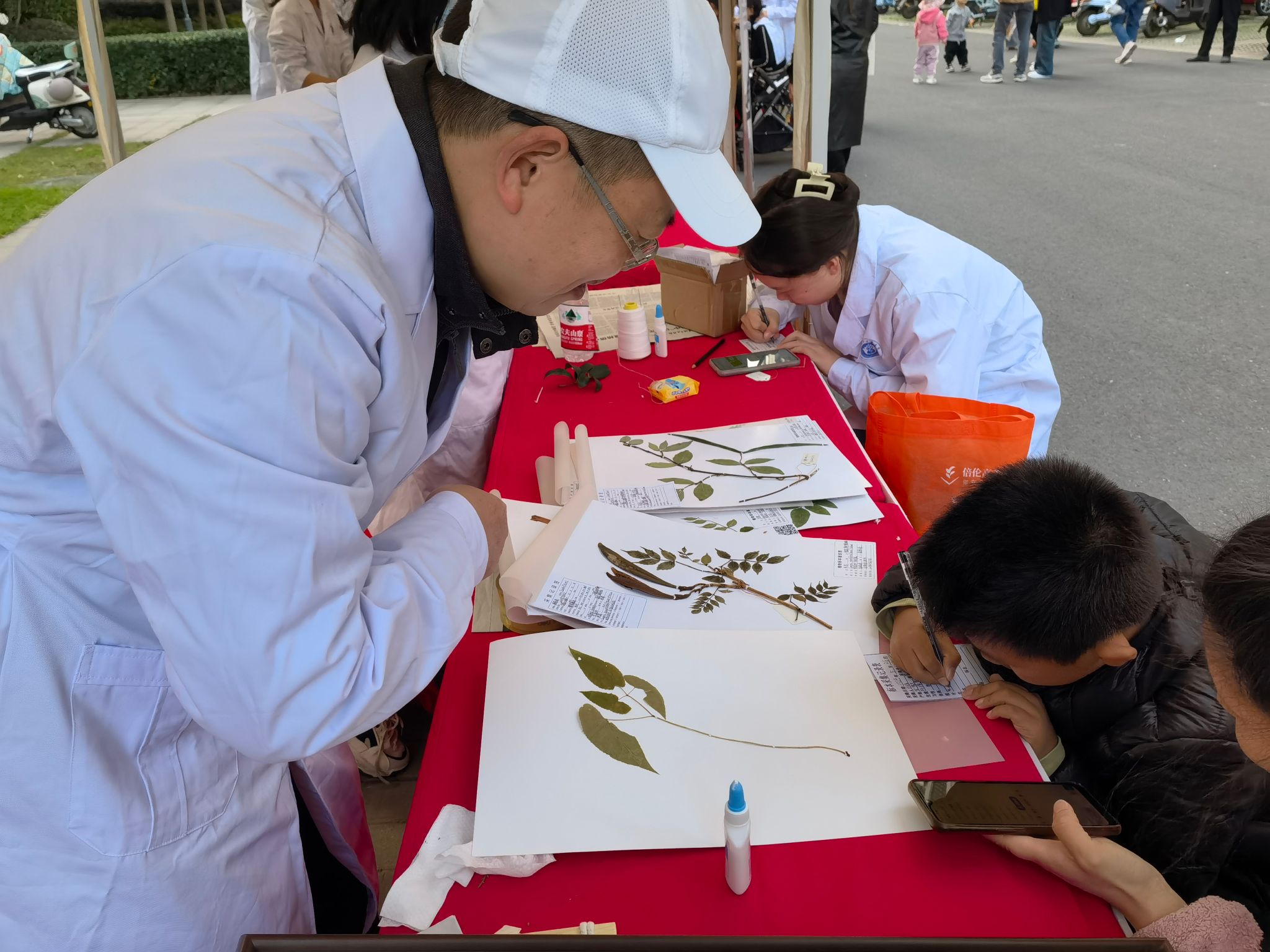 中药标本展示区也吸引了不少民众驻足。志愿者们详细地介绍了各种中药标本的采集地点和形态功效。现场还有几位刚接完孩子放学的妈妈,陪着小朋友一起体验中药标本的制作,在这个过程中,小朋友化身“小小中药标本制作师”,一个个在庆兆老师的细心指导下,制作出了满意的中药标本作品。“希望这样的活动越多越好,我们家孩子觉着这个做中药标本的活动特别有意思”,刚刚陪孩子制作中药标本的李女士如是说。此外,为了传播新安医学文化,学院党委特意设计了新安医学趣味问答游戏,为社区居民和小朋友们准备了中药香囊,本草书签,红枣枸杞钥匙扣等精美的礼物,居民在游戏中收获了知识,对于新安医学这个安徽地域医学流派也有了更深刻的了解。