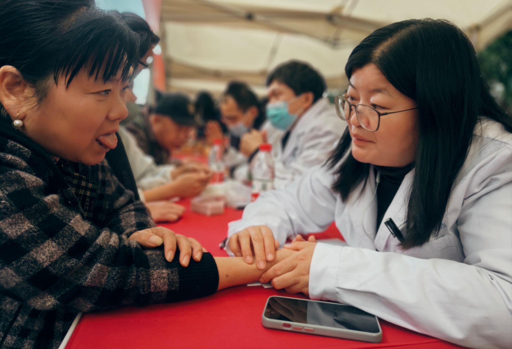 (图3 中医学院李玲秀老师在给居民望舌诊脉 通讯员彭桂利摄)
