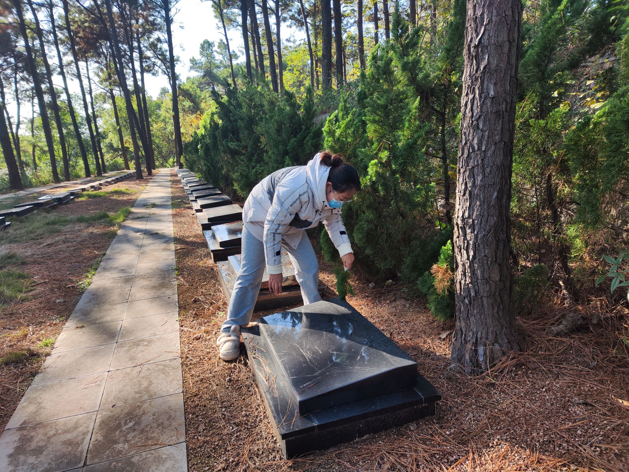 在烈士陵园,同志们排队缓缓前行,现场入党积极分子们用双手仔细清扫每一座烈士的墓碑,清除落叶,除掉杂草,擦去灰尘。从山上下来后,全体学生在烈士英名纪念墙前久久伫立,心中默念着先辈们的英名。