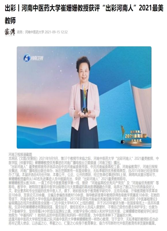 崔姗姗,河南中医药大学中医基础理论教研室主任,教授,硕士生导师。中原教学名师,河南省高等学校教学名师,河南省一流人才,河南省优秀教师,“出彩河南人”2021最美教师,河南省特殊津贴专家,河南省教科文卫体系统“师带徒”标兵,河南中医药大学首届仲景教学名师。国家一流课程负责人。任世界中联教指委理事,教育部中医学类专业教指委资深专家,香港浸会大学中医药学院中医学课程咨询委员会委员,全国中医基础理论专业委员会委员,世界中联仲景传承与创新专业委员会理事。